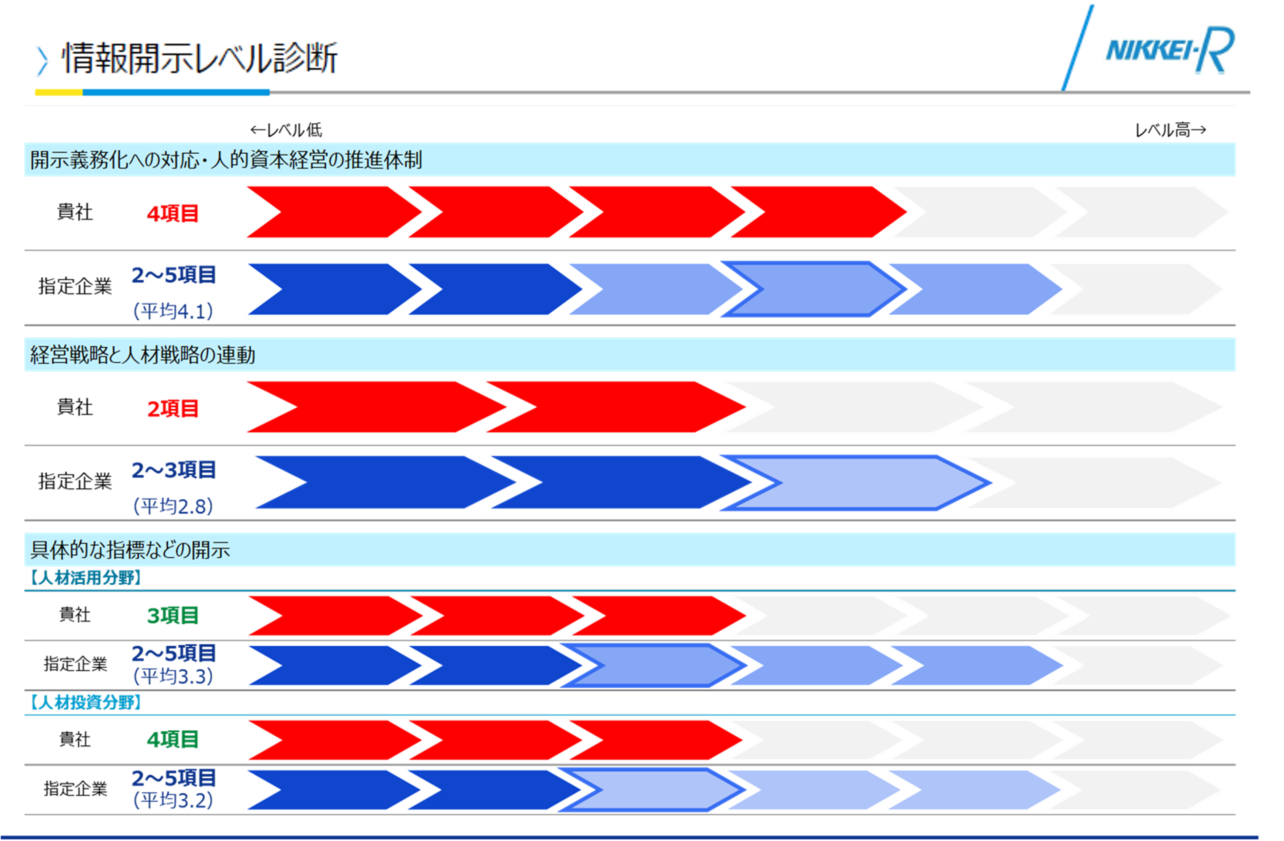 ・ワンランク上の企業群と自社の現状を比較することで課題を把握し、人的資本データ開示の参考や優先して取り組むべき課題の特定に活用いただけます